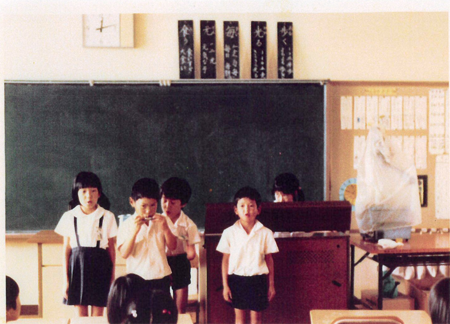 音楽の授業のようで、ハーモニカを吹いている子やオルガンを弾いている子もいます。