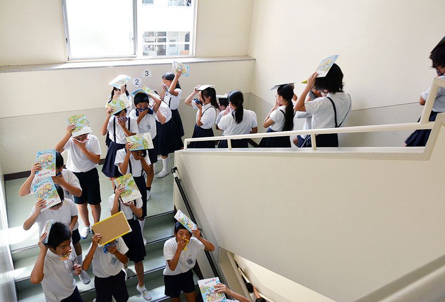 写真は避難訓練の様子と、大規模災害が発生したことを想定した引き渡し訓練の様子です。