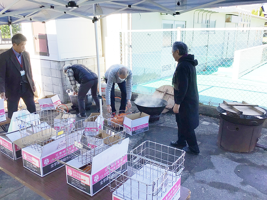 地域のボランティアの皆様のご協力のもと、新在家・染野地区からお借りした資材を使った温かい救給カレーの炊き出しが行われました。